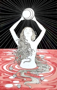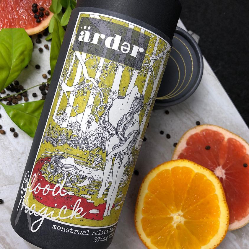I was commissioned to draw a pen and ink illustration in a traditional style depicting two women bathing for Arder’s Blood Magick balm tube packaging.