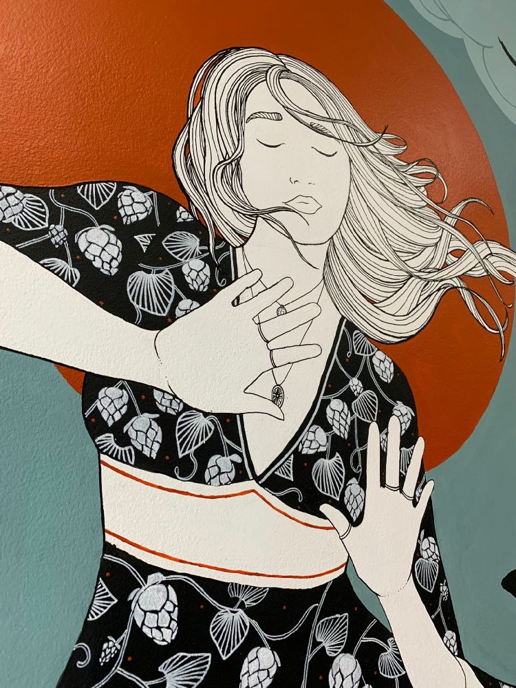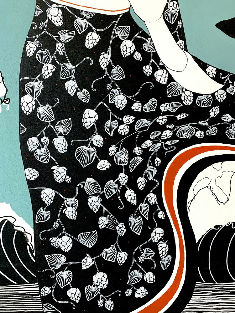 The painting is based on the idea of a local sea witch legend, conjuring up the seas with her will. I also added a touch of hops magic, with a hops pattern on her billowing dress.