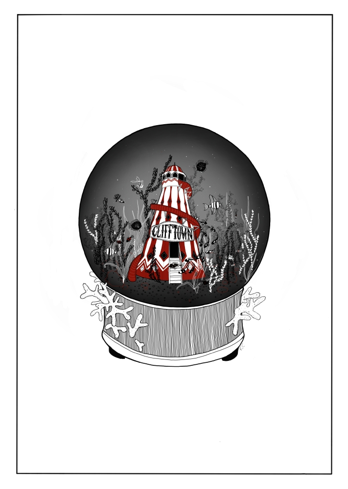 I illustrated a typical, seaside trinket of a snow globe and added the iconic Helter skelter ride from Sea front amusement parks within the globe, surrounded by aquarium fish and fauna going about their business…